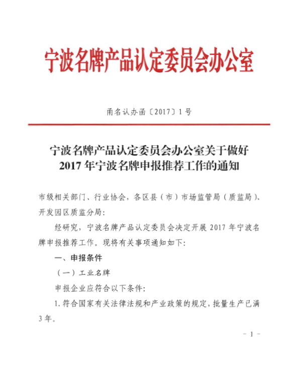 2017年宁波市名牌产品认定